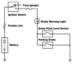185. 某車輛煞車警示燈電路如下圖,技師甲說:該電路圖顯示,當煞車油面高度不足時燈會亮起;技師乙說:當手煞車放下時則警示燈應亮起,何者敘述較正確?