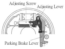 186. 某鼓式煞車如下圖示,當要調整煞車間隙時,技師甲說:拆開煞車鼓利用起子轉動 AdjustingScrew 調整;技師乙說:裝回煞車鼓後拉動手煞車拉桿數次即可,何者敘述較正確?
