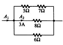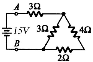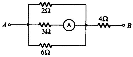94. 下圖所示,電流表 A 之讀數為 4A 時,A、B 兩端之電壓為