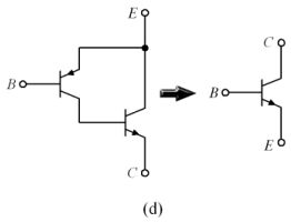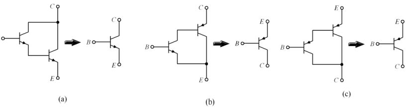 75. 如下圖所示達靈頓電路,等效於單一個電晶體,下列何者正確?