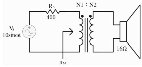 83. 下圖電路所示,若想要有最大功率轉移,則調整圖中變壓器初級與次級線圈之圈數比(N1:N2)與揚聲器可得之最大功率應為何?