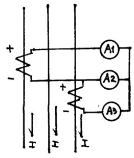36. 如下圖以三個電流計、二個比流器測量三相平衡負載電流之接線方式,則各電流計之讀值為