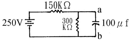 46. 如下圖所示,若以伏特錶(額定值 300V,內阻 300KΩ)跨接於電容器兩端,則伏特錶應指示為