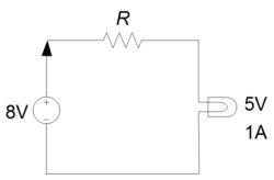 51. 下圖所示電路,燈泡額定電壓為 5 伏特,欲得額定電流為 1 安培時,則應串聯電阻 R 為