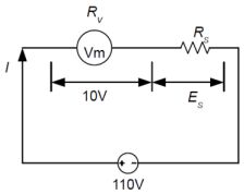)為 150 歐姆,今欲使用此電壓表測定 110 伏特之電壓,則應串聯電阻(R
