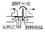 108. 下圖為加工件經過翻轉機構順時鐘轉 90 度,試問驅動翻轉機構之氣壓缸應以何種方式安裝,才能順利動作?