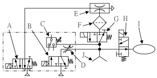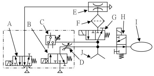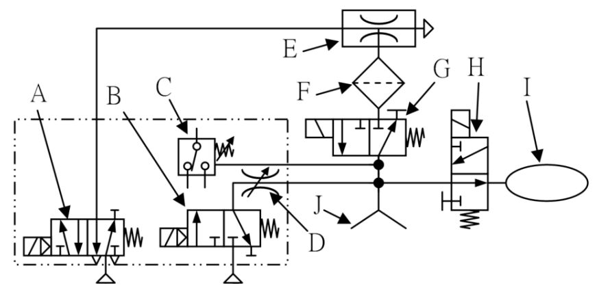 134. 下圖為一套真空產生系統,可利用常壓空氣轉換為真空壓吸取物件,請問〝E〞閥件的名稱為何?
