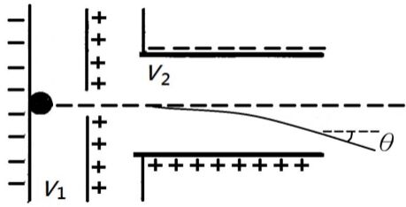 9 在真空中有兩組平行電板,如圖所示,左側兩片電板的電位差為 V1,提供電子的加速作用;右側兩片電板的電位差為 V2,提供電子的偏向作用。電子在左側兩電板間由靜止開始向正右方運動,射入右側兩平行電板中,入射方向與右側兩帶電板平行。若忽略重力,則在滿足電子能射出平行板的條件下,下列那種實驗改變,一定能使電子的偏轉角度 θ 變大? (A) V1 變大、V2 變大 (B) V1 變小、V2 變大 (C) V1 變大、V2 變小 (D) V1變小、V2變小