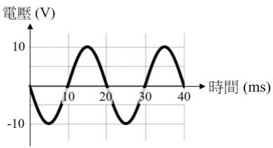 17 如圖所示,一個交流電源的電壓與時間關係圖。此交流電源的頻率與以三用電表交流檔位量到的電壓分別為何? (A)頻率為 50 Hz、電壓為 7.1 V (B)頻率為 50 Hz、電壓為 10 V (C)頻率為 50 Hz、電壓為 14 V (D)頻率為 60 Hz、電壓為 14 V