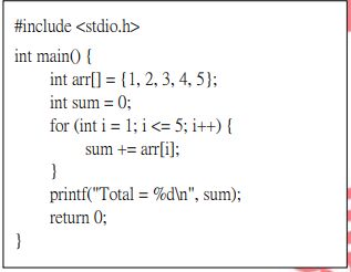 25. 以下是一段 C 語言程式碼的片段,目的是計算陣列中所有元素的總和,請問這段程式碼中存在什麼錯誤?(A) 陣列未初始化 (B) 指定陣列索引範圍越界 (C) sum 變數未正確宣告為浮點數 (D) 應該要 return 1