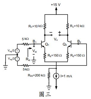 三、圖三 BJT 差動放大器,假設 NPN 電晶體的 β = 100,求輸入差分電阻 與電壓總增益 。