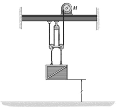 二、如圖所示,木箱質量 100 kg,初始狀態, s =0 時,木箱為靜止;若木箱被提升至s =3 m 時,馬達 M 對纜繩施加的拉力為 250 N,求此時木箱速度為何?(忽略繩索和滑輪的質量及其之間之摩擦) (15 分)