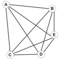 18 下圖爲一個無向圖(Undirected Graph) ,下列敘述何者錯誤?(A)該圖是一個完全圖(Complete Graph) (B)該圖是一個連通圖(Connected Graph) (C)一個有 n 個節點的連通圖,必定要有 n(n-1)/2 條邊 (D)該圖可以利用廣度優先搜尋(Breadth-First Search, BFS),建構一棵生成樹