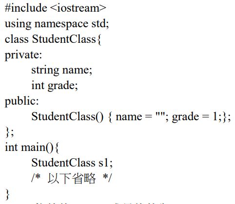 30 下列的 C++程式碼片段,下列敘述何者錯誤? (A) s1 物件的“grade”成員的值為 1 (B) s1 物件的“name”成員的值為空字串 (C)在主程式被省略的程式碼裡,可直接執行「cout << s1.grade;」 (D)“name”是“StudentClass”的私有資料成員(private data member)