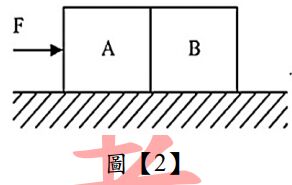 44. 如圖【2】所示,水平外力F作用於兩個緊鄰的物體A與B,已知物體A質量20kg,物體 B質量30kg,物體A及物體B與地面間之靜摩擦係數分別為0.25及0.2,則可使得兩物體即將開始產生滑動的最小外力F為多少N?(設重力加速度為10m/sec2 ) (A) 100 (B) 110 (C) 120 (D) 130