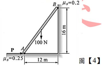 9. 如圖【4】所示,梯子重100N,梯與地板之靜摩擦係數µs=0.25,梯與牆之靜摩擦係數µs=0.2,若欲阻止梯子開始向左側下滑動,試求最小作用力P=_________N。(請以四捨五入計算至小數點後1位)