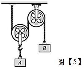 10. 如圖【5】所示之滑輪系統,設繩索、滑輪之重量與摩擦均忽略不計,重力加速度g=10m/sec²,若所懸掛之A物體重量為10N,B物體重量為20N,試求B物體上方之繩的張力=__N。(請以四捨五入計算至小數點後2位)