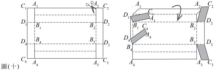 25. 芳芳用一張長度為 3 尺、寬度為 2 尺的紙板設計紙盒,從長度為 3 尺的兩邊 Ai 點剪至 B i 點,再將 A i 點對折至 B i 點,並將長方形 AiB iD iCi插入內部以固定紙盒,其中 i = 1 , 2 , 3 , 4,作法如圖(十)所示。設 = a 尺,且= 2a 尺,i = 1 , 2 , 3 , 4。若摺出的紙盒有最大體積,則 a=?(A) (B) (C)(D)