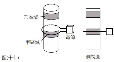 45. 如圖 ( 十七 ) 所示,一個厚度一致的均勻圓柱形鋁罐放在一不接觸且不移動的線圈當中,鋁罐各區域的溫度原先都相同,甲區域與乙區域的寬度相同,當線圈中的電流在極短時間內從零變到非常大,甲區域與乙區域的平均溫度,何者升得較高?該區域因線圈電流改變而影響之受力方向為何? (A) 乙區域、向鋁罐下方推動 (B) 乙區域、向鋁罐上方推動 (C) 甲區域、向鋁罐外側膨脹 (D) 甲區域、向鋁罐內側擠壓