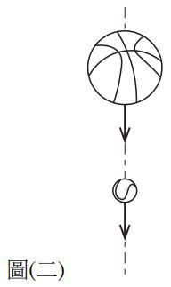 5. 小玉在15層樓高的建物上,兩手各持一顆籃球( 0.620公斤)和一顆網球( 0.062公斤),讓它們高度相距30公分,如圖(二)所示。將手伸出樓層外,使球懸空,然後同時釋放兩顆球,一段時間後,小丸子在 2 樓陽台同時觀察到兩顆球,下列敘述何者正確?( 忽略空氣阻力)(A) 籃球會追上網球 (B) 籃球的速度會比網球快 (C) 網球的速度會比籃球快 (D) 兩顆球的高度差維持不變