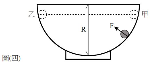 12. 如圖 ( 四 ) 所示,假設半徑 R 之半球形的碗壁上甲、乙兩處之水平高度相等,一鋼珠由甲處自由釋放,於理想情形下可到達乙處。運動過程中碗壁施加於鋼珠之正向力 F 共作功 多少? (A) 0(B) FR/ 2 (C) FR (D) 2FR