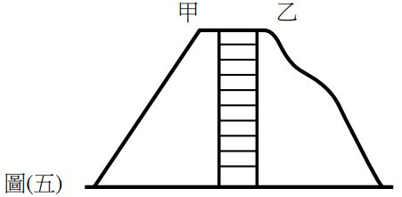 14. 遊樂場內有兩條滑水道高度相同,但軌道形狀不同,如圖 ( 五 ) 所示,甲為一直線、乙為有彎曲變化。若忽略下滑過程中摩擦力、空氣阻力的影響,則下列何者正確? (A) 下滑所需時間相同 (B) 到達底部時的速率相同 (C) 兩滑水道下滑之加速度相同 (D) 兩滑水道下滑之加速度為定值
