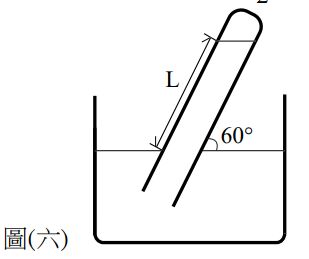 20. 如圖 ( 六 ) 所示,一裝滿水銀之試管,將其傾斜插入裝滿水銀之盆子中,試管與水平夾60度。於一大氣壓之環境下,水銀柱長L為多少公分?(sin 60 ° = 、 cos60 ° = ) (A) 76(B) (C) (D)