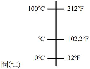 21. 小美因為身體不舒服,拿起電子耳溫槍測量耳內溫度,耳溫槍螢幕顯示 102.2 ℉,則小美耳內溫度為多少℃?[可參考圖(七),以方便獲得換算公式](A) 38(B) 38.6 (C) 39 (D) 39.6