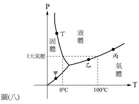 23. 阿德在高度2000公尺的山上露營,晚餐生火煮飯時,因為高山上氣壓為0.8大氣壓力,水在 85 ℃ 就沸騰,需花費較多的時間才能將飯煮熟,則此煮飯過程中的沸騰現象,對應在圖(八)水的三相圖中的哪一點?(A) 甲(B) 乙 (C) 丙 (D) 丁