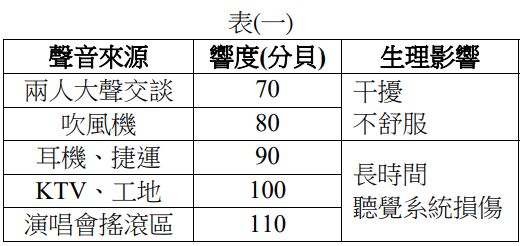 28. 表(一)列舉了幾個環境噪音表現的響度(分貝),及對心理或耳朵生理可能造成的影響,其中響度每增加 10 分貝,噪音強度 ( 瓦特/ 平方公尺 ) 增加 10 倍,則演唱會搖滾區的噪音 強度是兩人大聲交談強度的幾倍? (A) 40(B) 400 (C) 1000 (D) 10000