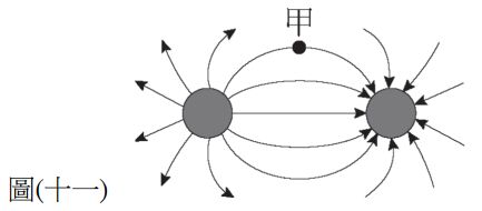 33. 兩個位置固定的點電荷電力線分佈如圖 ( 十一 ) 所示,則關於電力線之敘述,下列何者錯誤?(A) 左邊的點電荷為正電荷 (B) 甲點電場方向為水平向右 (C) 兩點電荷間的電場分佈為均勻的 (D) 法拉第提出以電力線的觀念描述電場