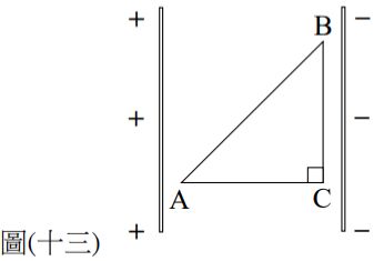 37. 一帶電平行板如圖 ( 十三 ) 所示,中間有均勻電場 600 伏特 / 公尺,內有 A、B、C 三點,A、C與 B、C的距離均為1公尺,BC 連線平行帶電平行板。若B 點的電位為10伏特, 則下列敘述何者正確?(=1.414 ) (A) A點的電位為610伏特 (B) A點的電位為858伏特 (C) C點的電位為610伏特 (D) C點的電位為858伏特