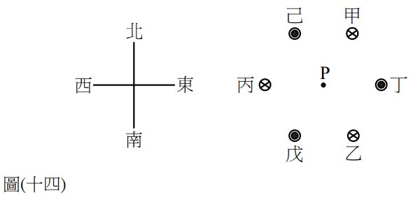 40. 如圖 ( 十四 ) 所示,垂直試卷紙面的六根長直導線,與 P 點的距離都是 R,相鄰兩導線的距離也都相同。六根導線中的電流大小都相同,其中標示為甲、乙、丙的三根導線中的電流,向下流入紙面,標示為丁、戊、己三根導線的電流,向上流出紙面,此時在 P 點 的淨磁場大小為零。如果將丙導線的電流降為零,則P點的淨磁場方向會指向哪個方向? (A) 向東 (B) 向南 (C) 向西 (D) 向北