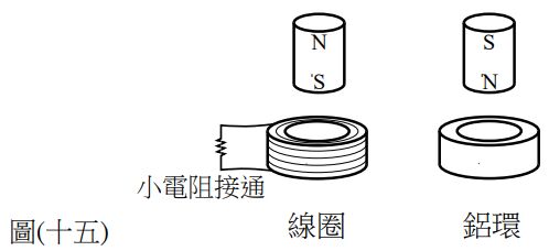 42. 如圖 ( 十五 ) 所示,在水平的平面上有一個線圈和一個圓環狀的鋁塊,兩者相距甚遠,線圈兩端經一小電阻導通,當向下移動的兩磁鐵各自接近線圈與鋁環時,下列敘述何者正確? (A) 線圈中發生感應電流,但不受力;鋁環中有感應渦電流,受到磁鐵施加的作用力向下 (B) 線圈中不存在渦電流,所以不受力;鋁環中有感應渦電流,受到磁鐵施加的作用力 向上 (C) 線圈中發生感應電流,受到磁鐵施加的作用力向下;鋁環中有感應渦電流,受到磁鐵 施加的作用力向下 (D) 線圈中發生感應電流,受到磁鐵施加的作用力向下;鋁環中有感應渦電流,受到磁鐵 施加的作用力向上
