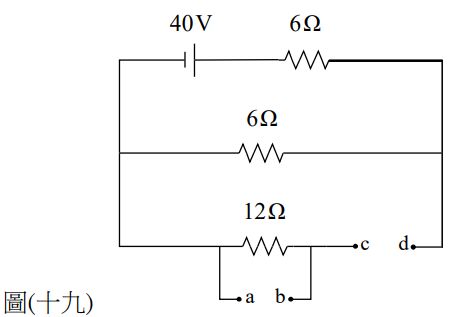 49. 老師拿給小明安培計與伏特計要小明量出12歐姆電阻的電流與電壓,如圖(十九)所示,則下列何者正確?(A) a、b點接安培計、a點接正端;c、d點接伏特計、c點接正端 (B) a、b點接安培計、b點接正端;c、d點接伏特計、d點接正端 (C) a、b點接伏特計、a點接正端;c、d點接安培計、c點接正端 (D) a、b點接伏特計、b點接正端;c、d點接安培計、d點接正端