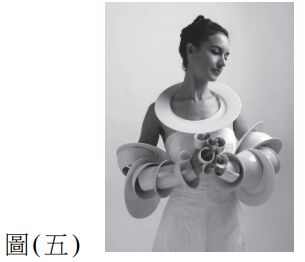 10. 瑪麗‧彭黛利(Marie Pendaries)以幽默手法重新詮釋法國「嫁妝」的傳統習俗,她將整套餐具大膽切割成一件件飾品如圖 ( 五 ) ,看似高雅實際卻沉重如盔甲般,暗示傳統帶給女性的繁重負擔,此創作屬於下列何種靈感啟發? (A) 內心世界的想法 (B) 傳統敘事設計 (C) 聯想力的設計 (D) 時事引用的想法