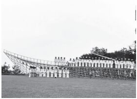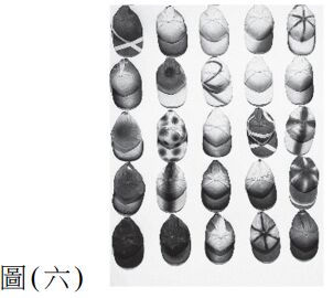 11. 校外教學參觀紡織展,牆面上排列的棒球帽,如圖(六),屬於下列何種平面展示構圖?(A) 曲線構圖(B) 圓形構圖(C) 均衡構圖(D) 斜角構圖