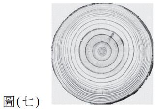 14. 在認識環境與樹木之間的關聯性時,透過觀察樹木的年輪,發現具有深淺的顏色及寬窄的紋理所構成的肌理如圖(七),此屬於下列何種平面構成?(A) 點、線、面三元素 (B) 空間與量體結構 (C) 重疊與交叉方式 (D) 交錯銜接形式