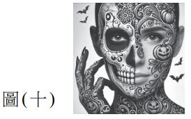 21. 小敏利用噴槍彩繪水性顏料、眼影、色鉛筆、代針筆、牛奶筆、立可白等多媒材,完成圖(十)萬聖節創意彩妝設計圖,此創作運用下列何種法則? (A) 去除法則(B) 加成法則 (C) 替換法則 (D) 操縱法則
