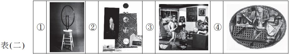 23. 表(二)中何者屬於立體主義的作品?(A) ①為馬歇爾‧杜象(Marcel Duchamp)的作品《現成的自行車輪》(Bicycle Wheel Ready-made) (B) ②為馬克斯‧恩斯特(Max Ernst)的作品《郵差需瓦勒》(The Postman Cheval) (C) ③為理查‧漢彌爾頓(Richard Hamilton )的作品《究竟是什麼使今日家庭如此不同, 如此具有魅力?》(Just what is it that makes today's homes so different,so appealing?) (D) ④為巴勃羅‧畢卡索(Pablo Ruiz Picasso)的作品《藤椅上的靜物》(Still Life with Chair Caning)
