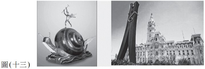 29. 圖(十三)西班牙藝術家達利(Salvador Dali)作品《蝸牛與天使》(Snail and the Angel),在蝸牛上方安置一個相對微小的天使,與瑞典藝術家歐登柏格 ( Claes Oldenburg ) 作品 《洗衣夾》(The Clothespin Sculpture),展現日常生活小物件轉化如建築般的尺度;有關此兩件雕塑作品的造型構成法則,下列敘述何者正確?(A) 在整體造型上進行畫面分割創造空間感 (B) 運用比例的變化創造不同的視覺效果 (C) 重複畫面中的視覺元素使畫面產生統一性 (D) 運用移位效果創造線條與形狀的動感