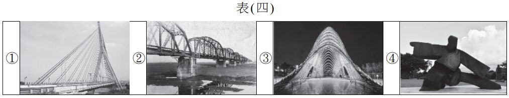 30. 有關表(四)立體作品的敘述,下列何者正確?(A) ①為高屏溪斜張橋,使用塊材元素,以古典美學手法搭建,呈現厚重風格(B) ②為下淡水溪鐵橋,搭建手法為塊材元素,創造封閉的形體,充分呈現空間深度(C) ③為台中世界花卉博覽會豐原展區的「竹跡館」,打造臺灣意象,為塊材元素表現(D) ④為朱銘雕塑作品「太極系列」《單鞭下勢》,多以去除法將不必要的部分雕除,呈現塊立體構成