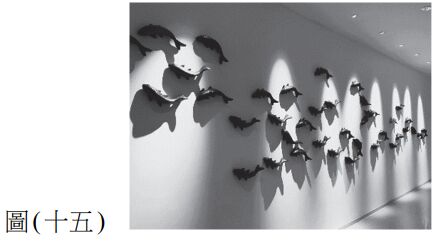37. 某飯店的牆上裝飾著以魚為元素的活躍姿態之半立體作品如圖 ( 十五 ) ,此為下列何種展示方法?(A) 焦點透視排列(B) 滿版連續排列(C) 錯位分散排列(D) 並肩排列