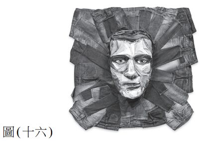 39. 土耳其藝術家德尼茲‧薩格迪奇(Deniz Sağdıç ),將回收的牛仔布製成碎片,運用深淺不一的藍色牛仔褲及金屬釦與皮標等,創作出逼真的肖像作品如圖(十六),屬於下列何種意象創作?(A) 抽象(B) 擬仿(C) 詮釋(D) 符號