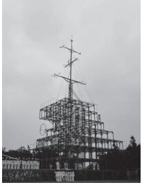 48. 圖 ( 十七 ) 的造形原理屬於一種形象、記號或是表徵符號,構成中含有結構、位置、安排與組合,由於穿透性佳,即便體積龐大,也較無視覺與心理上的壓迫感,以上敘述屬於 下列何種要件? (A) 色彩 (B) 質感 (C) 形態 (D) 對比