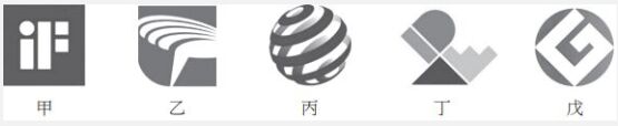 28. 有關標誌甲、乙、丙、丁的造形構成方式,下列敘述何者正確? (A) 甲-漸變構成 (B) 乙-對稱構成 (C) 丙-律動構成 (D) 丁-錯視構成