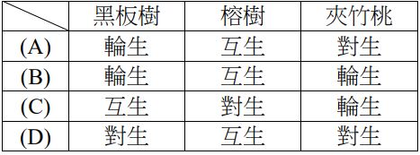 7. 葉在莖上分布的型態叫做葉序,可分為互生、對生及輪生。有關下列常見樹種的葉序,何者正確?