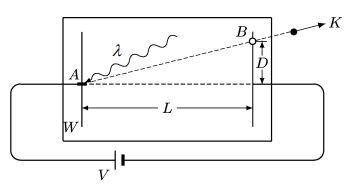 1. 如圖所示,波長為λ的光子照射功函數為 W 的金屬表面。由正極板中央 A 點釋出的光電子經由電壓為 V 的平行電板 作用後,最後經由負極上方的小孔 B 逸出。已知正負極板相距 L,小孔 B 與負極板中心點相距 D。假設小孔甚為微 小,不會影響電子受電極的加速運動。則電子由小孔逸出時,其最大動能 K 為___________________。( e>0 為電子電 荷大小, V> 0,h 為卜朗克常數)