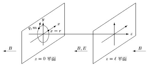 2. 空間中有−z 方向的均勻磁場 B;在 0≤z ≤ 的區域另有−z 方向的均勻電場 E。質量為 m,電量絕對值為 q 的電荷,在 z< 0 的區域,一方面向 +z 方向等速行進,一方面繞 z 軸做半徑為 r 的圓周運動(運動方向在 z = 0 平面的投影如圖所 示)。若電荷通過 z = 的平面後,運動速度的 z 分量為vz 。若地球引力的影響可以不計,在 z< 0 區域時,總動能為 __________________。