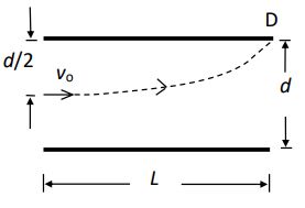 5. 有一平行板電容器,內部為真空,兩個電極板的間距為 d,每一個正方形電極板的長均為 L。電容器內有一均勻電場,其量值固定為 E =V/d ,V 為兩個電極板間的電位差,如圖所示。電子從電容器左端的正中央以初速 vo射入,其方向平行於電極板之一邊,並打在圖上的 D 點。電子的電荷以−e 表示,質量以 m 表示,重力可不計。試問電子的初速 vo至少必須大於_______________,電子才能避開電極板,逸出電容器外?(以 e,m,L,d 及 V 表示)